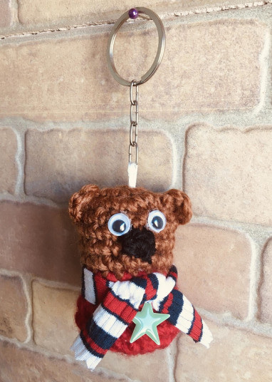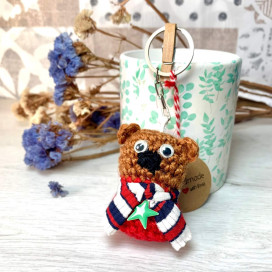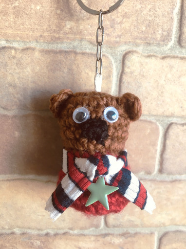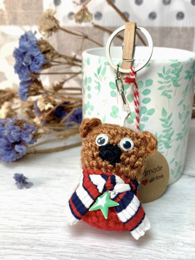 I'd like to show you this cute little teddy bear, part of my Amigurumi key ring collection. It has been carefully crocheted and represents the values of friendship, love, trust and care. It's a real lucky charm!