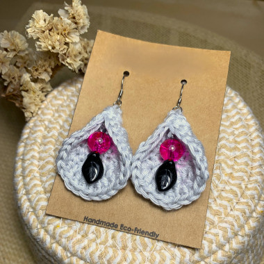 Pendientes de color gris claro, tejidos cuidadosamente a mano con algodón satinado de color gris claro. Son perfectos para todos tus looks elegantes y casuales. Combinan con cualquier otro color, pero también con cualquier estilo.