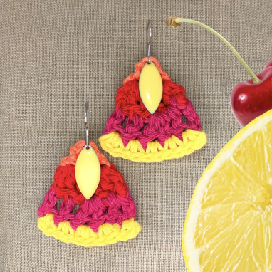 Llénate de vitaminas con estos coloridos pendientes triangulares tejidos a mano.
