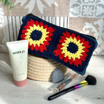 Trousse-pochette en tissu bleu denim, cousue à la main et décorée de deux carrés Granny crochetés avec du fil de coton naturel et éco-responsable....