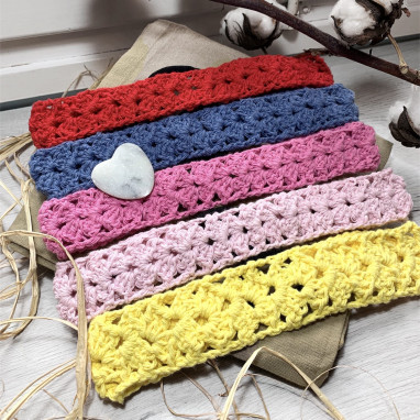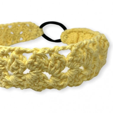 Bandeau jaune pour cheveux, crocheté à la main avec du fil de coton recyclé. Caractéristiques : élastique. taille unique, fait main.