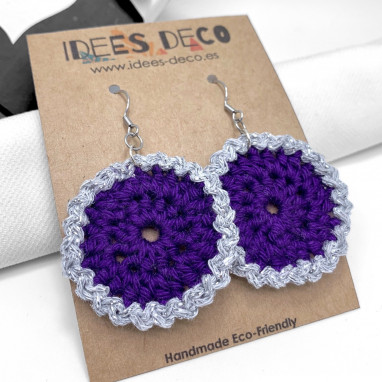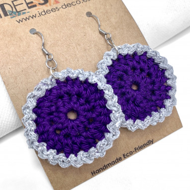 Ces jolies boucles d’oreille sont réalisées à la main. Le contour argenté est crocheté avec du fil de coton gris brillant et la partie centrale...