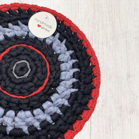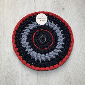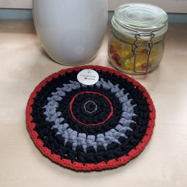 Ce dessous de plats apportera une touche de couleur à votre décoration. Il a été crocheté à la main. Pratique et très décoratif, il protégera vos surfaces de la chaleur et des rayures. Chaque modèle est unique. La matière qui le compose est 100 % éco-responsable car fabriquée à partir de tissu recyclé.