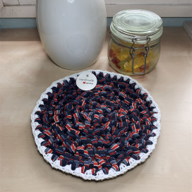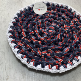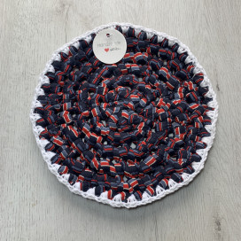 Ce dessous de plats apportera une touche de couleur à votre décoration. Il a été crocheté à la main. Pratique et très décoratif, il protégera vos surfaces de la chaleur et des rayures. Chaque modèle est unique. La matière qui le compose est 100 % éco-responsable car fabriquée à partir de tissu recyclé.