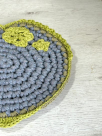 Chaque point de ce dessous de plat raconte une histoire. Le tissu recyclé, soigneusement sélectionné et transformé en fil, lui confère une personnalité unique et un engagement pour l'environnement. La bordure verte en coton vient délicatement souligner sa forme et apporter une finition soignée.