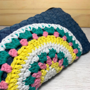 Trousse-pochette faite avec du tissu bleu denim, cousue à la main avec fermeture éclair et doublure en tissu à l'intérieur. Décorée d'un demi-mandala, crocheté avec plusieurs couleurs de coton naturel.