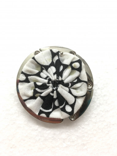 Accroche-sac décoré d'un Yoyo de tissu, couleurs: noir et blanc. Dessous antidérapant. Idéal pour accrocher son sac lors d'un moment détente en terrasse.